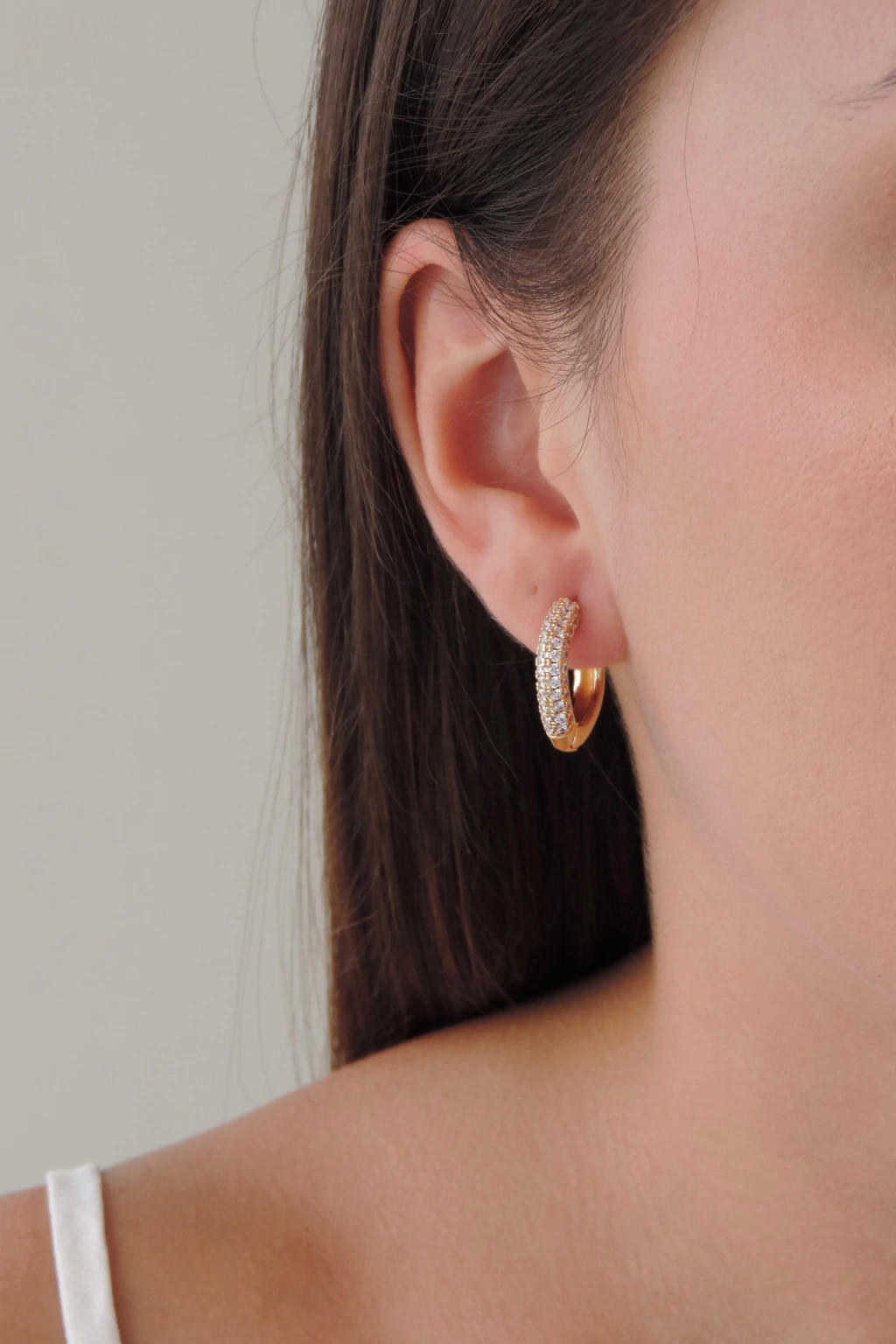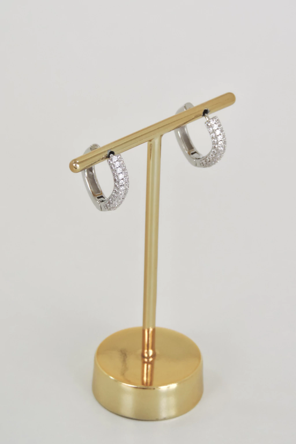 Argola quadrada cravejada, tamanho pequeno, modelo de brinco em argola com tarraxa tipo click. Folheada e com banho flash, confeccionada em metal. Cravejada com zircônias para brilho discreto. Peso de 2,8 g e altura de 1,9 cm. Não hipoalergênico e não níquel free.