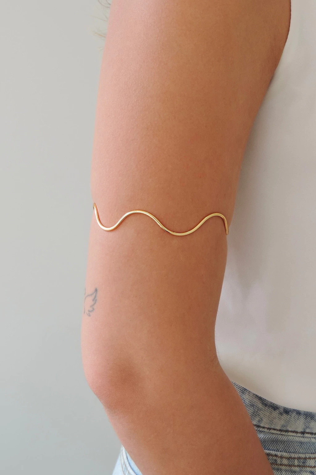 Descubra o estilo contemporâneo do Bracelete Superior Ondas, uma peça regulável com design inspirado em ondas suaves. Ideal para complementar looks casuais ou mais sofisticados, com acabamento folheado para brilho discreto.
