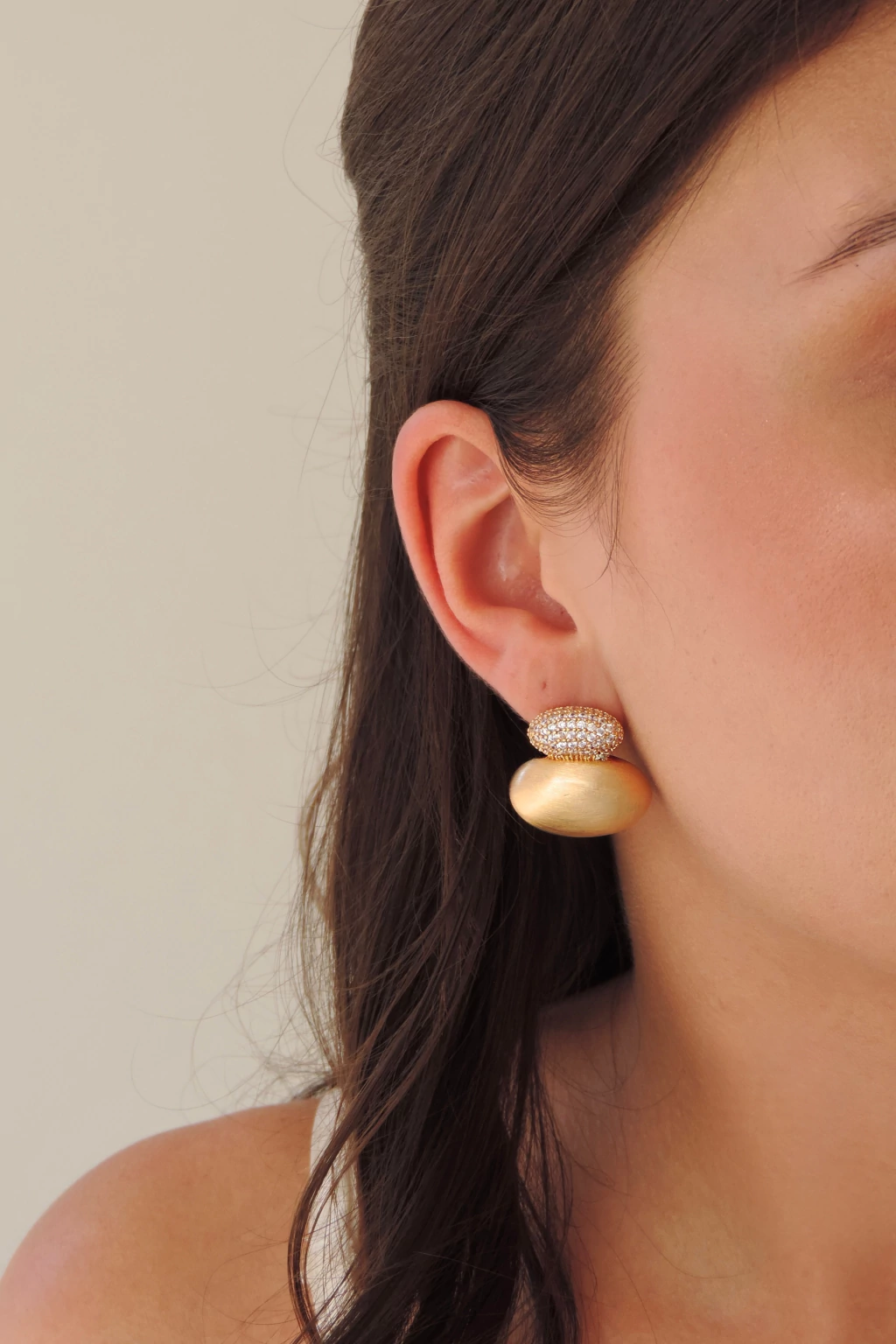 Brinco duplo em formato oval com acabamento fosco. Modelo tradicional, cravejado com zircônias para brilho discreto. Folheado com banho flash, leve e confortável para uso diário, combinando com diversos estilos.