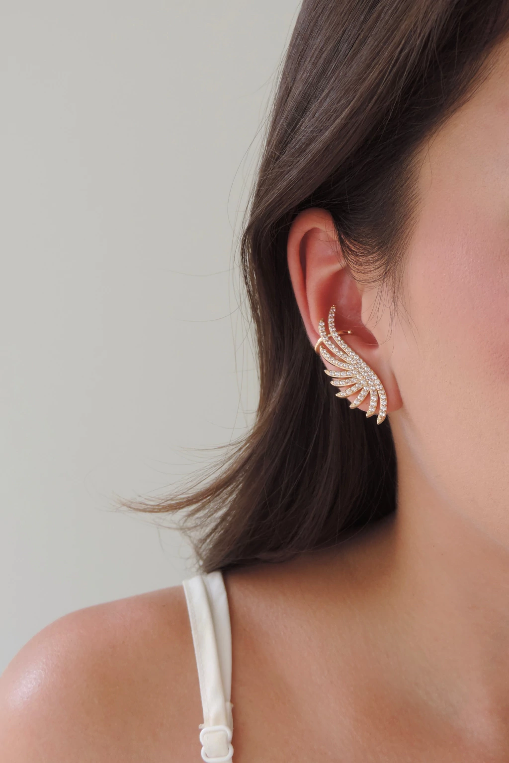 Conheça o Brinco Earcuff Fios Luxo. Este modelo de tamanho médio apresenta um design elegante em formato Earcuff com fios luxuosos e zircônias integradas na craveação. Confeccionado em metal com folheado em banho flash, oferece brilho discreto e sofisticação para uso em ocasiões especiais ou looks modernos do dia a dia. Tarraxa: sutiã para segurança e conforto. Observações técnicas: peso aproximado de 3,2 g, altura de 4,1 cm, cravejado com zircônias, sem verniz adicional.