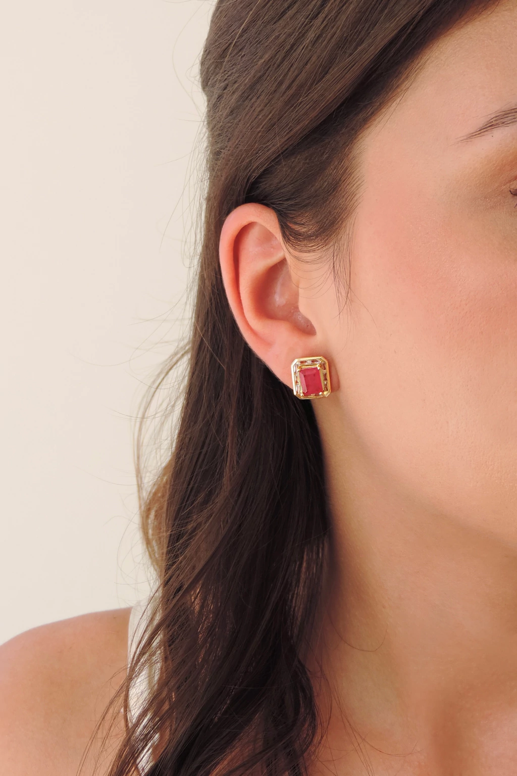 Brinco tradicional em formato quadrado com pedrarias cravejadas em zircônias. Tarraxa tipo borboleta, folheado com banho flash para brilho discreto. Material em metal, acabamento sem verniz. Design clássico e elegante, ideal para complementar looks casuais ou formais.