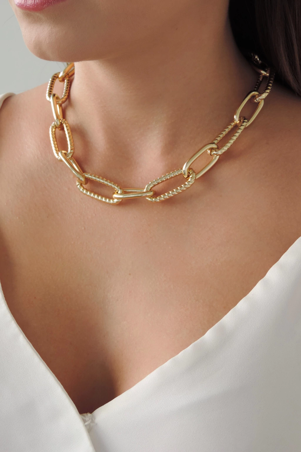 Complete seu visual com a elegante Chocker Corrente Elos Lisos Texturizados, uma peça moderna e versátil que combina estilo e conforto. Com comprimento de 34 cm e extensor de 10 cm, é totalmente regulável para se ajustar perfeitamente ao seu pescoço. Fabricado em metal folheado, esta chocker apresenta elos lisos com acabamento texturizado, sem cravejado ou verniz, oferecendo um visual clean e contemporâneo. Pesando aproximadamente 25,9 gramas, é uma peça robusta e confortável para uso diário ou ocasiões especiais. Ideal para quem busca uma peça statement que valoriza o pescoço com um toque de modernidade, a Chocker Corrente Elos Lisos Texturizados é uma escolha perfeita para compor looks estilosos e atuais. Use sozinha ou combine com outros colares para criar camadas elegantes.