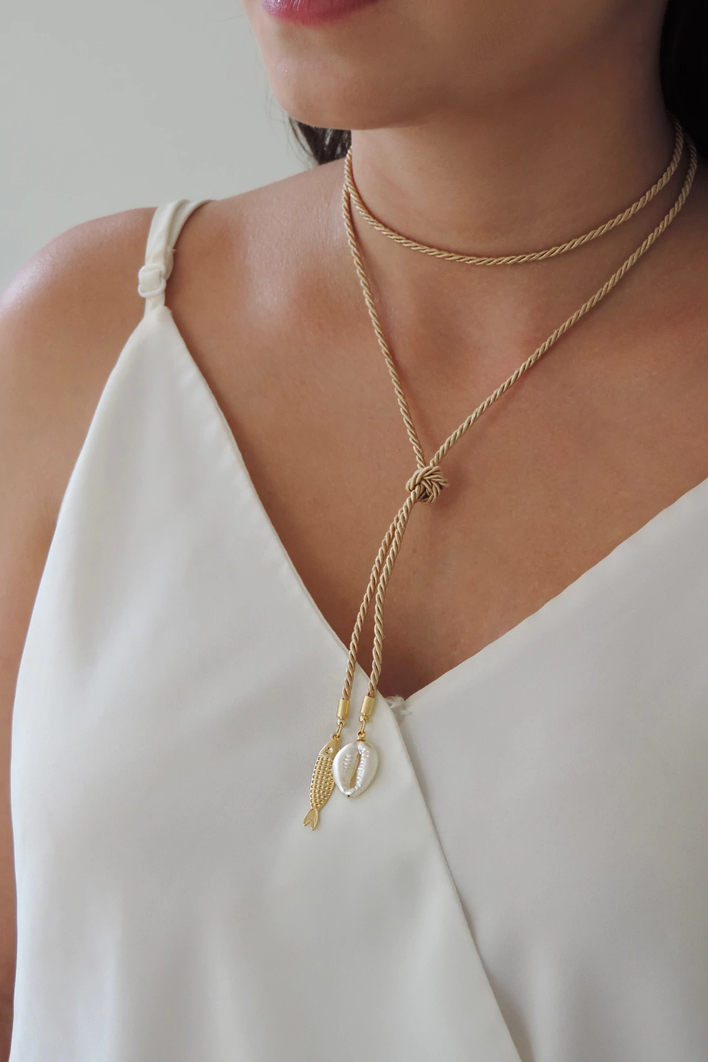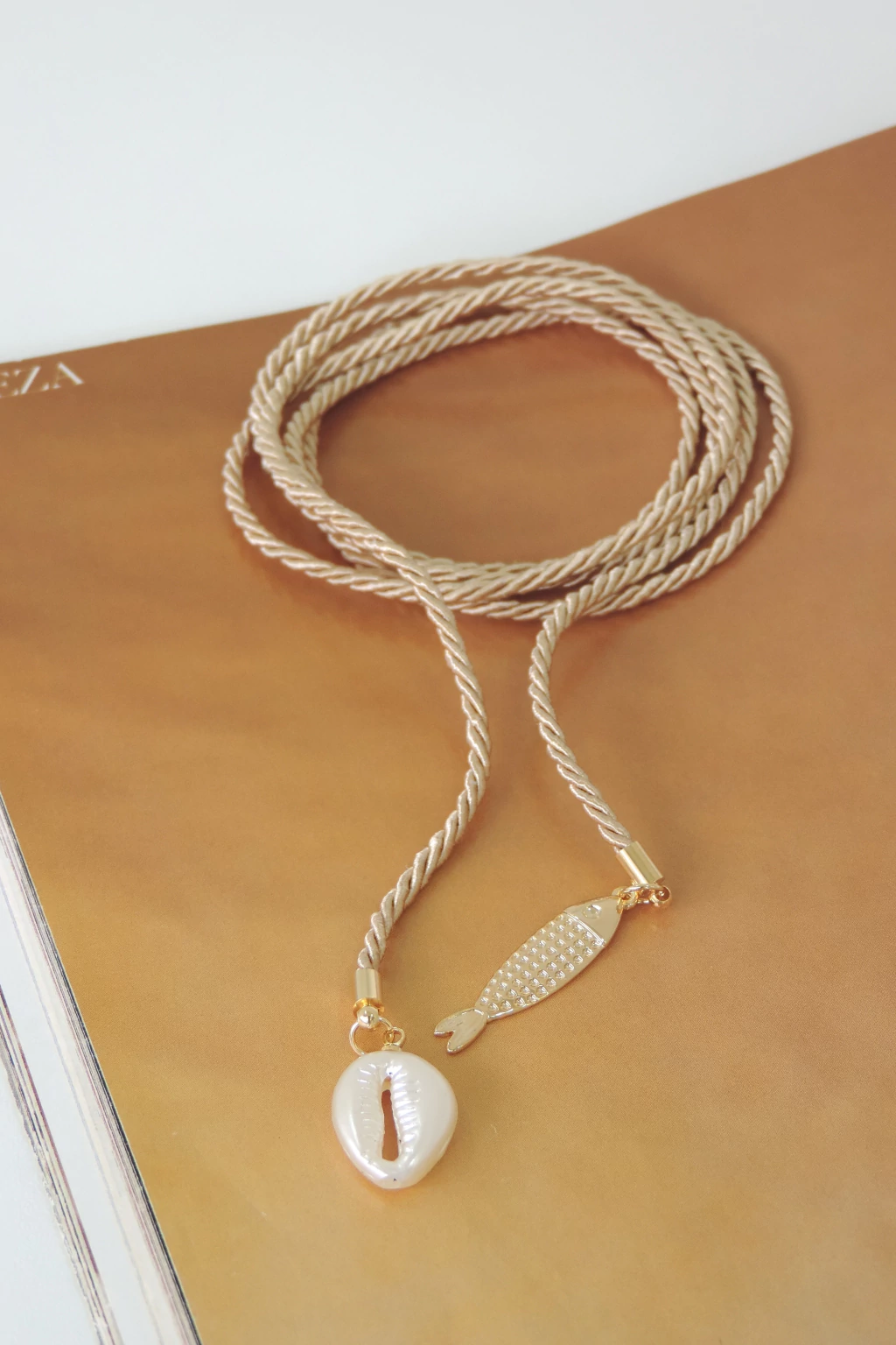 Este colar de cordão oferece um toque náutico e moderno para o seu estilo diário. Com pingentes cuidadosamente selecionados — búzio de 1,8 cm e peixe de 2,8 cm — o acessório traz um charme praiano sem perder a sofisticação. O modelo de amarração facilita o ajuste perfeito ao pescoço, garantindo conforto durante todo o uso.