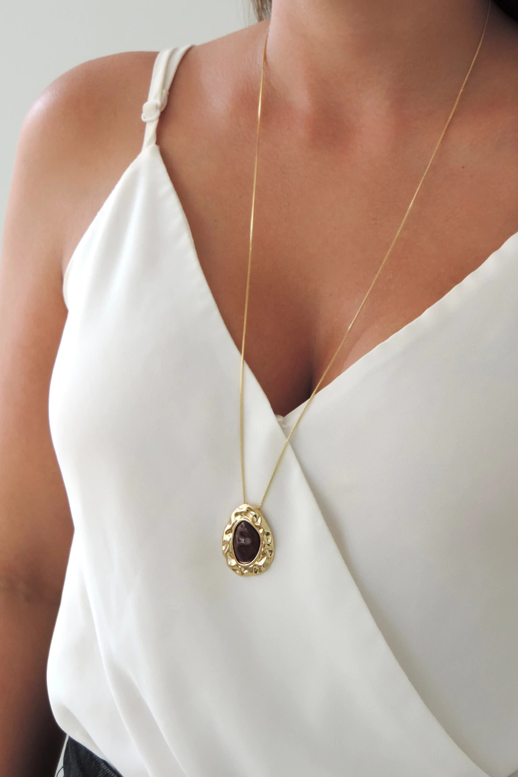 Colar longo com pingente orgânico esmaltado, trazendo estilo moderno e acabamento brilhante. Folheado, regulável e leve, ideal para looks casuais e diferenciados.