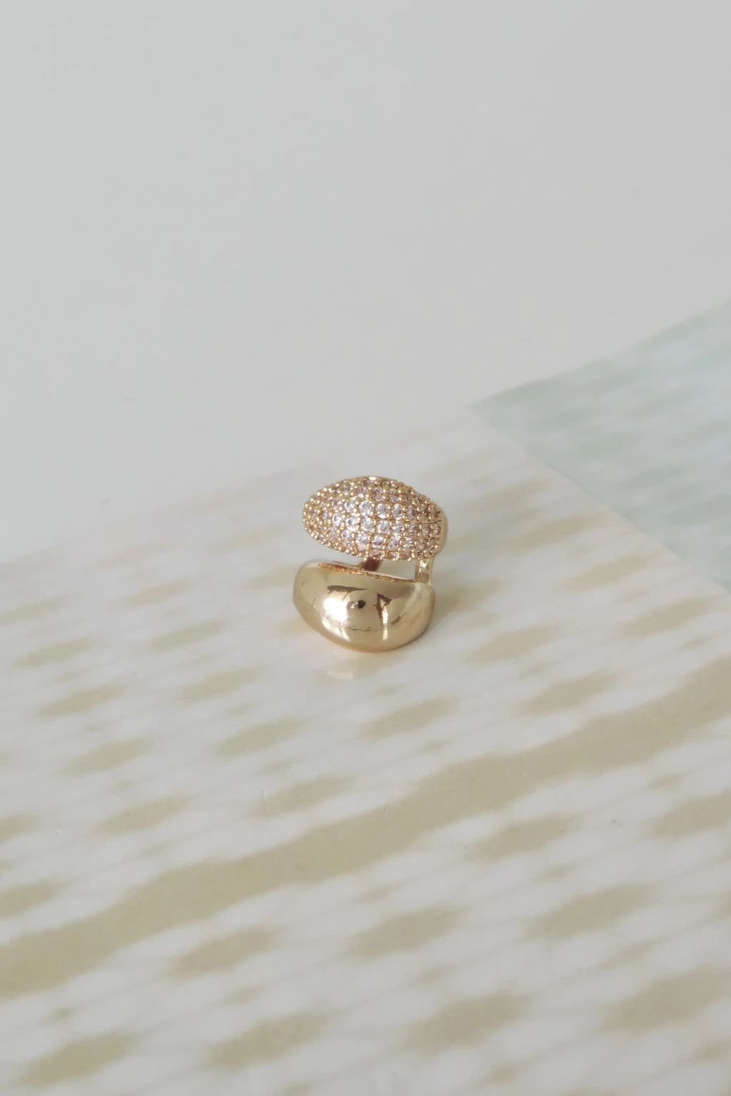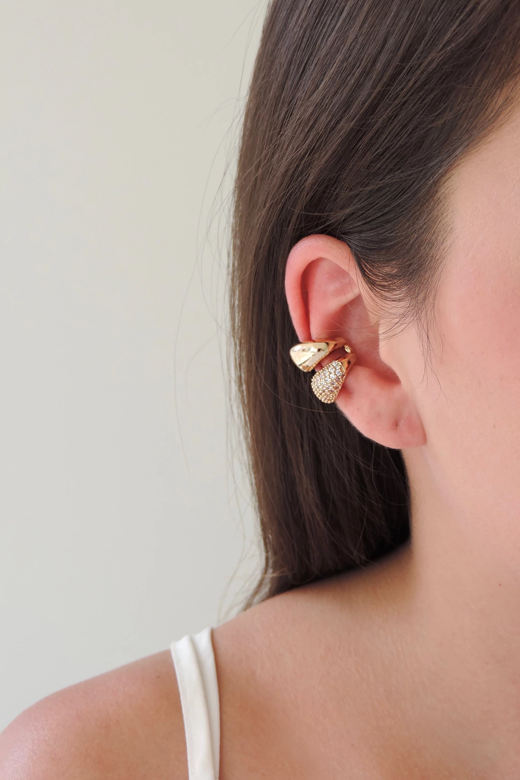 Piercing fake duplo em formato de gota, com zircônias cravejadas. Modelo unilateral, regulável não aplicável, folheado, peso 5 g e altura 1,9 cm. Ideal para quem busca brilho sem perfurar.